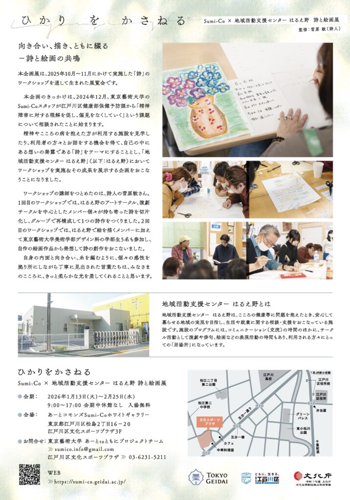 本企画のきっかけは、2024年12月、東京藝術大学のSumi-Coスタッフが江戸川区健康部保健予防課から「精神障害に対する理解を促し、偏見をなくしていく」という課題について相談されたことに始まります。精神やこころの病を抱えた方が利用する施設を見学したり、利用者の方々とお話をする機会を得て、自己の中にある想いの発露である「詩」をテーマに取り上げることを決定し、「地域活動支援センター はるえ野」(以下:はるえ野)においてワークショップを実施&その成果を展示する企画をおこなうことになりました。