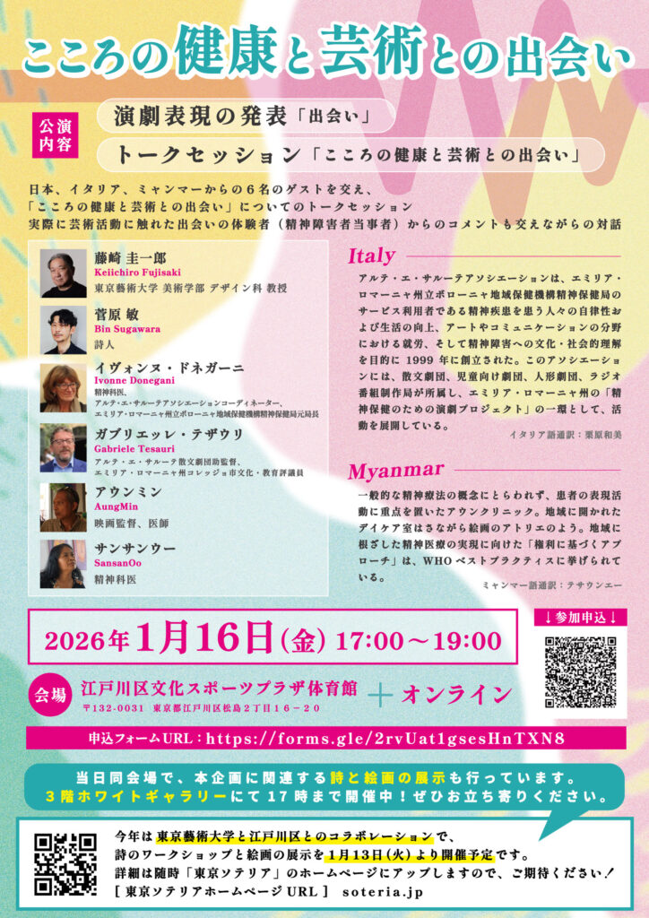 今回の展示のような絵画や詩の表現や演劇表現といった様々な芸術活動によって育まれるわたしたちのこころの健康についてのトークセッションに、Sumi-Coプロジェクトリーダーの藤崎圭一郎と、詩人で今回の展示のワークショップの講師をつとめられた菅原敏さんの2名が登壇いたします。